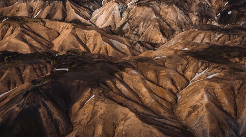 From Lakagígar we fly over to Landmannalaugar, the beautiful valley nestled right alongside the black Laugarhraun lava field, a large field of dried magma that formed in an eruption in 1477. Landmannalaugar is mostly known for its natural geothermal baths like the name suggests, the „people‘s pool“. These natural geothermal baths along with the unique windswept rhyolite mountains, with their various shades of pink, green, blue and golden yellow make this area amazing for snapping some photos from the air.