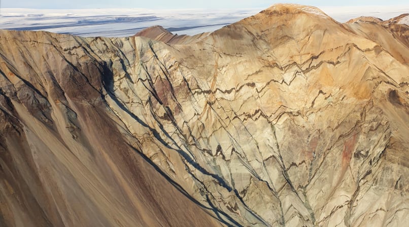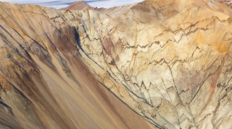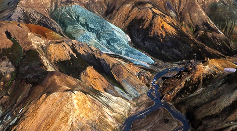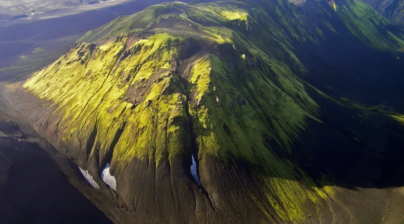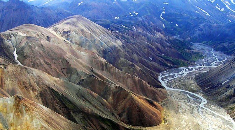 As we head towards Landmannalaugar, the second landing spot of the tour, we fly over the northeast part of Hekla's volcanic system and its wasteland which mixes with land shaped by large eruptions. At Landmannalaugar we fly over the Jökulgil valley, a landscape painted by colorful rhyolite mountains, black lava, and ash fields and mountains, winding glacial rivers, fumaroles, and moss. As we enter the Landmannalaugar and over the Jökulgil valley the landscape is painted by colorful rhyolite mountains, black lava, ash fields, and mountains, winding glacial rivers, fumaroles, and moss. Landmannalaugar is also known for its natural geothermal baths as its name suggests, the „people's pool“, and as a starting or end point of the most famous hiking trail in Iceland, the Laugavegur. It's a breathtaking visual experience enhanced by the bird's eye view perspective from the helicopter