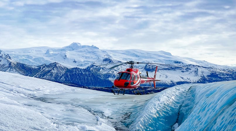 After taking off from Skaftafell Terminal we head on over to Skeiðarársandur, a vast plain of black sand, we, then, fly past Lómagnúpur, which houses one of Iceland's four guardian spirits that can be seen in Iceland's coat of arms, the „rock-giant“ (Bergrisi). He stands at the top of Lómagnúpur, holding his iron rod protecting the south coast from evil spirits. We had now to Mýrdalsjökull, hovering on the way, over the Fjaðrárgljúfur canyon, made famous by Justin Biber who used the location for one of its video clips. It is a visually stunning and ancient location, dating back to the Ice Age 2 million years ago. As we get closer to Mýrdalsjökull, the land gradually reveals the planes on which glacial floods happened, after eruptions of the volcano Katla. Katla is a large active volcano that sits basically under the ice cap of Mýrdalsjökull. Then we turn towards Eyjafjallajökull glacier which hosts under its cap a volcano that last erupted in 2010 where we have the option to land. After Eyjafjallajökull, we head to the coastline from where we can spot the mysterious Vestmannaeyjar archipelago of about 18 islands, just off the south coast of Iceland. From this point we keep flying along the coastline in the direction of Reykjavik airport, noting a few more places on the way.
